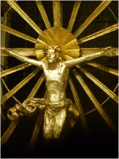 Theresia selbst ist - entgegen der üblichen Darstellungen - nicht mit Kreuz und Rosen zu sehen, sondern mit über der Brust verschränkten Armen, auf Wolken stehend. Sie stellt die Verbindung zwischen Himmel und Erde dar.